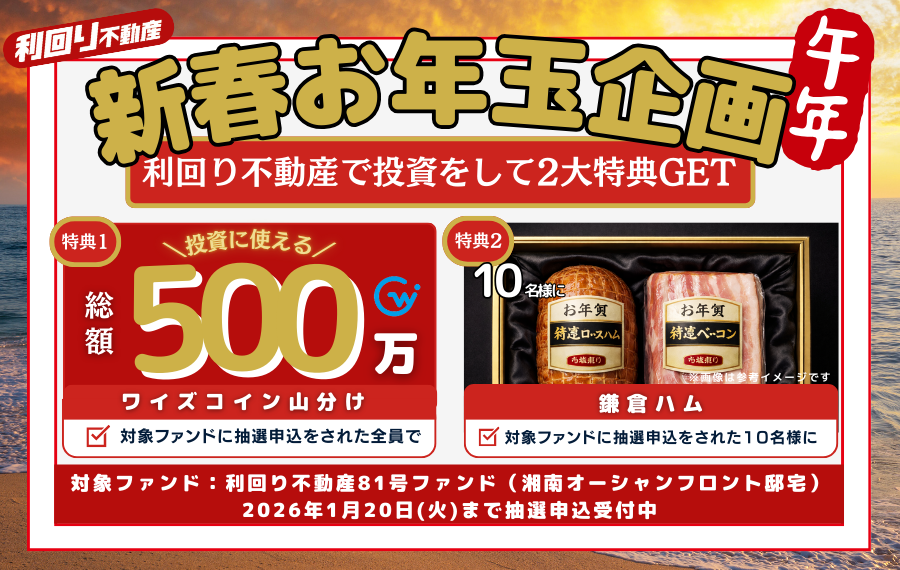 ③さらに1/20まで募集中の81号ファンド(湘南オーシャンフロント邸宅)に投資で500万ワイズコインを山分け、さらに抽選でハム当たります。